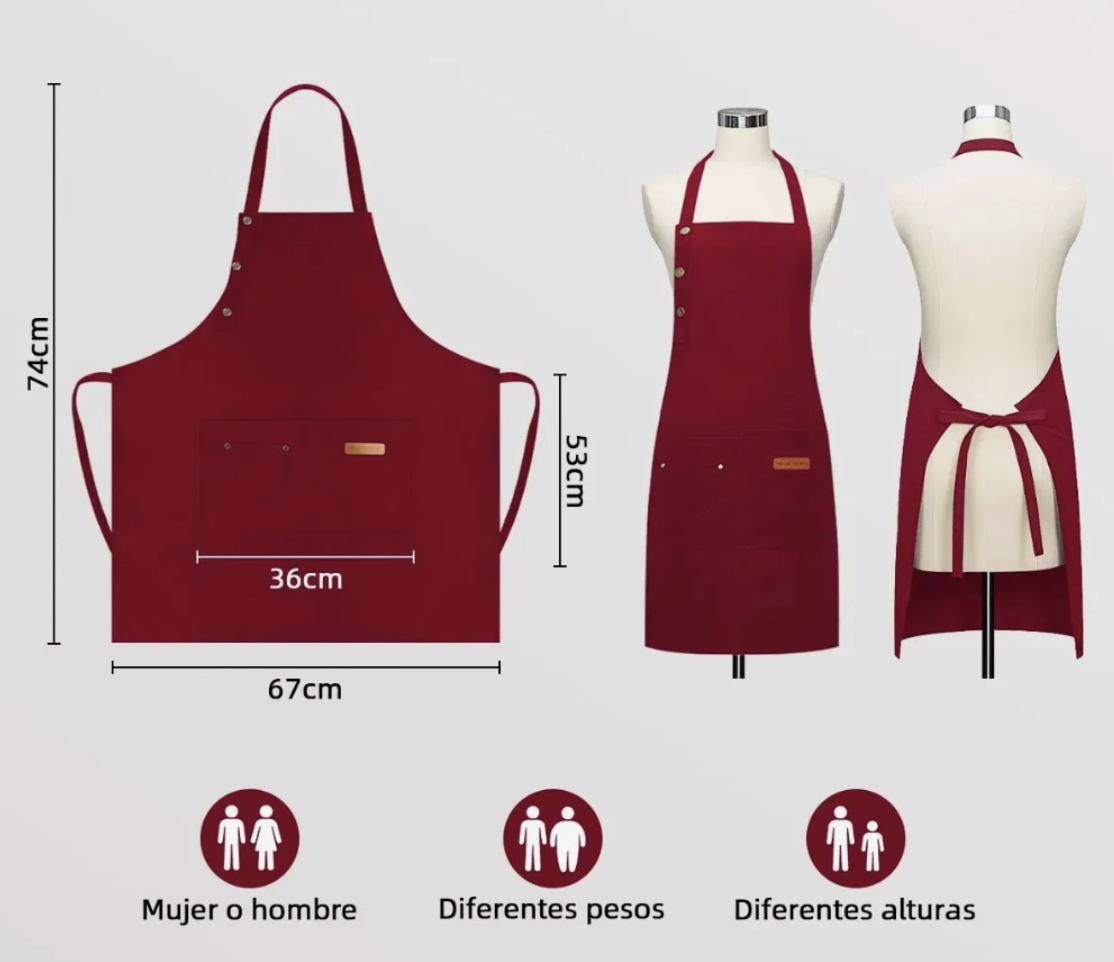 Delantal de cocina unisex resistente y cómodo, ideal para uso profesional o doméstico. Diseñado para proteger la ropa durante actividades como cocina, parrilla, cafetería, barbería, arte, estilismo o trabajos manuales.