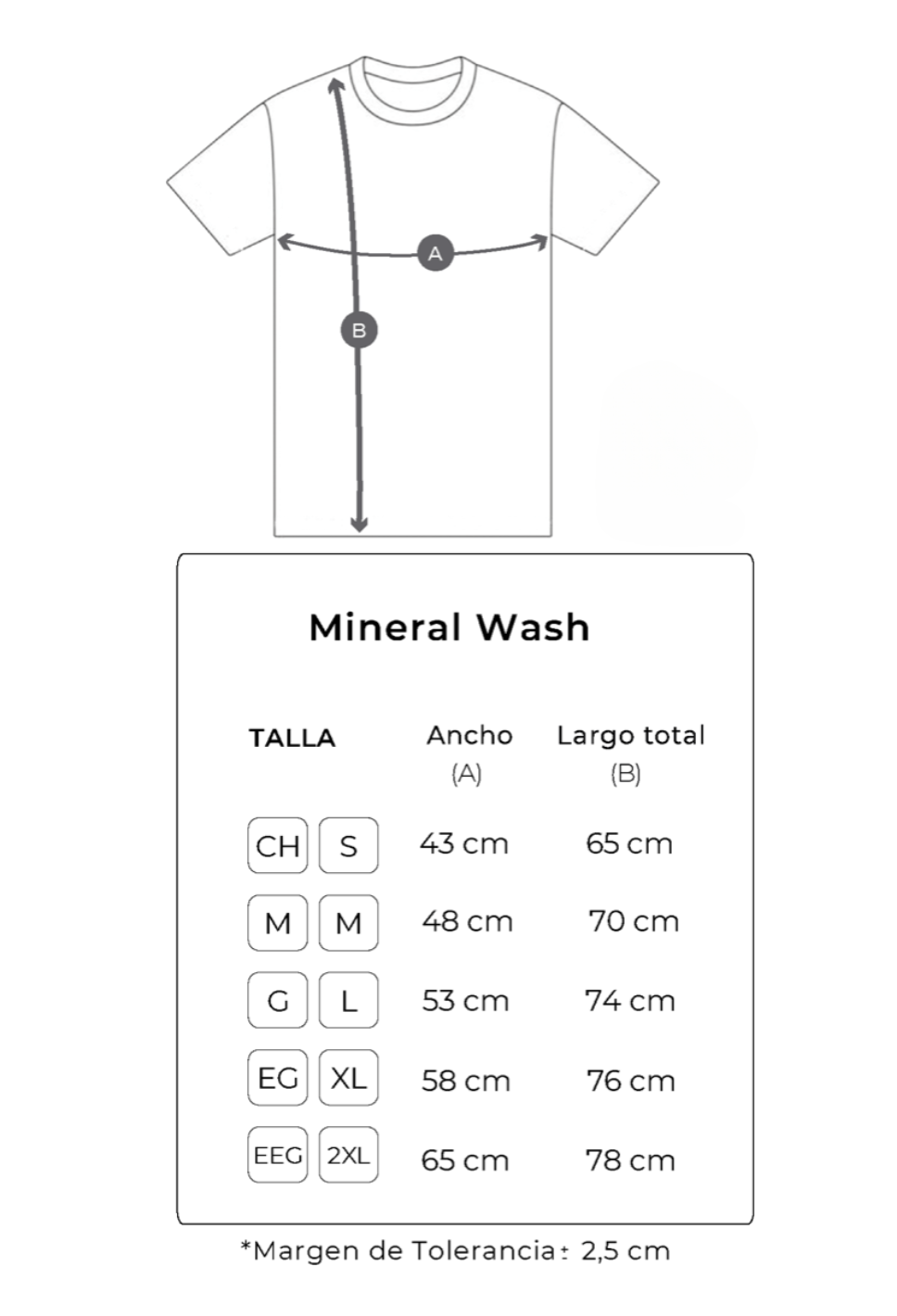 Debido al proceso artesanal Mineral Wash, cada prenda presenta variaciones naturales en tono y acabado.Estas diferencias son parte de su autenticidad y la hacen única.