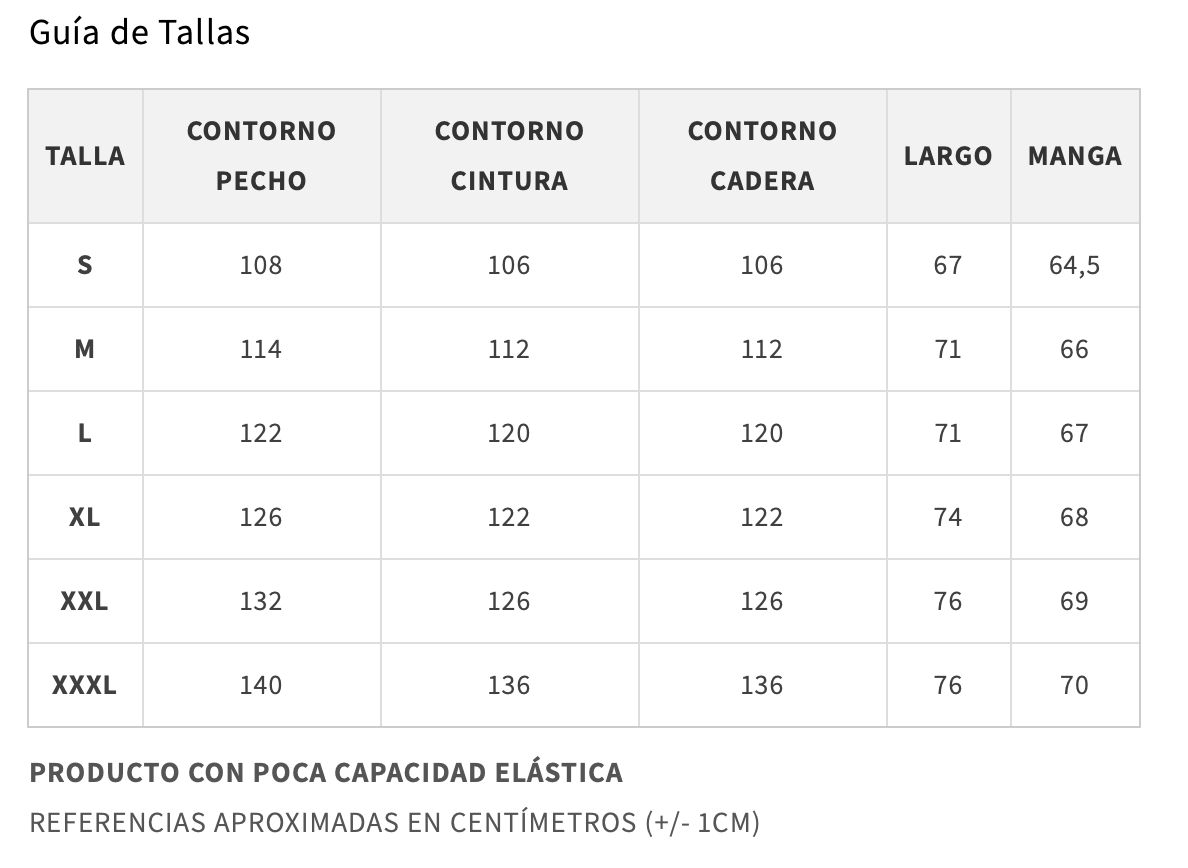• Tallas: S, M, L, XL, XXL, XXXL